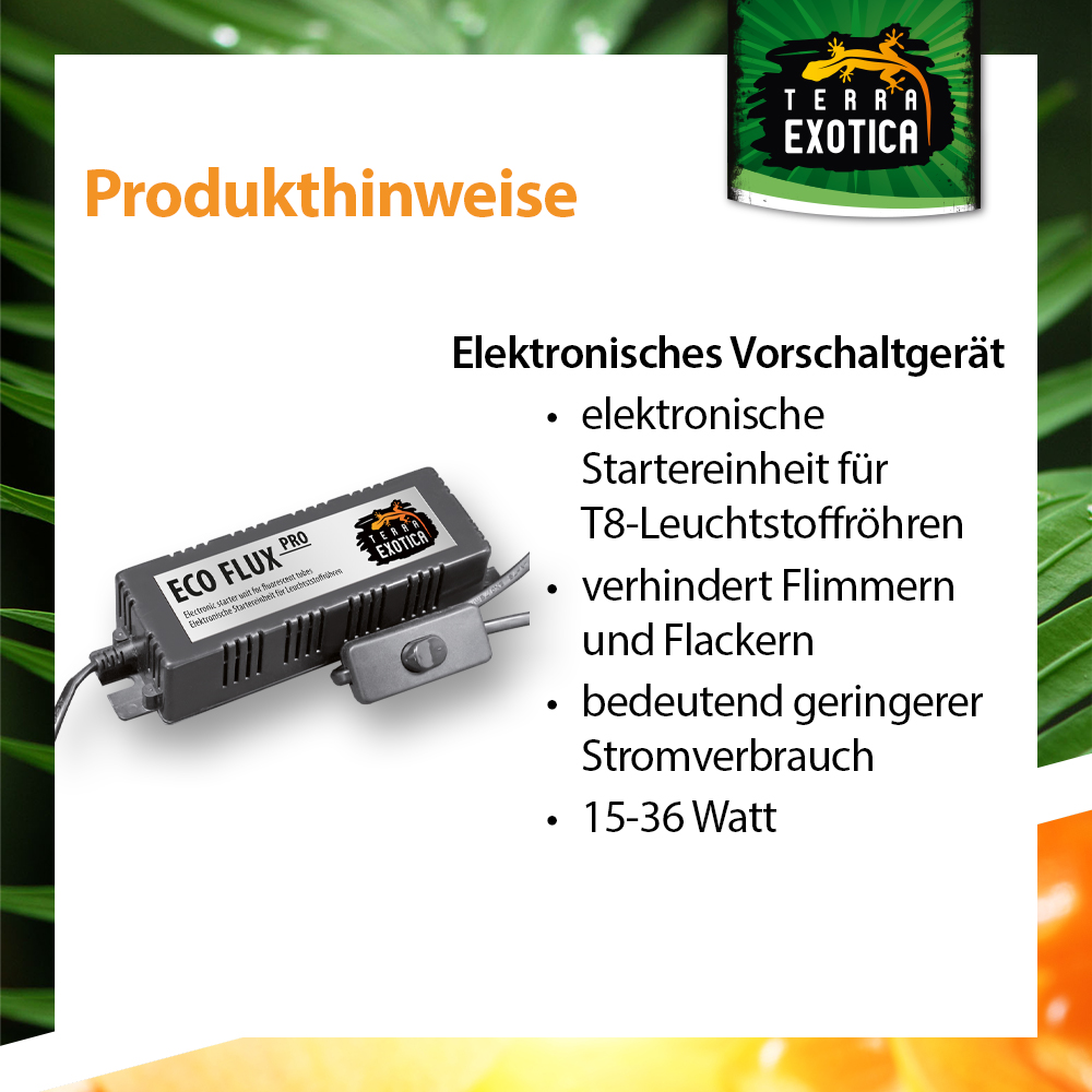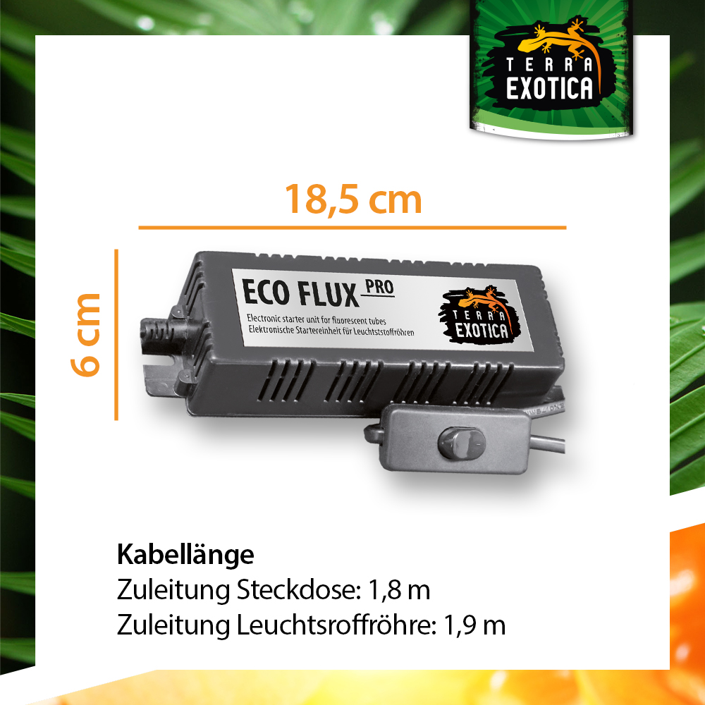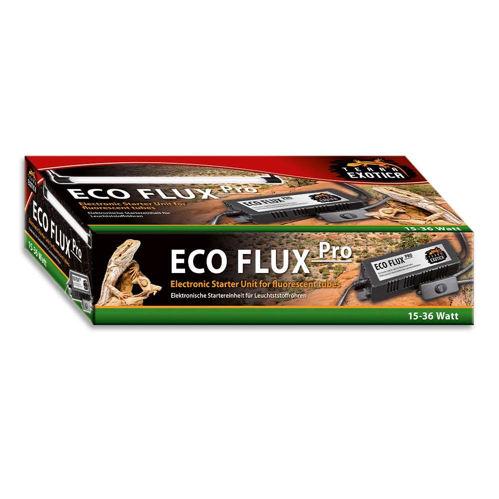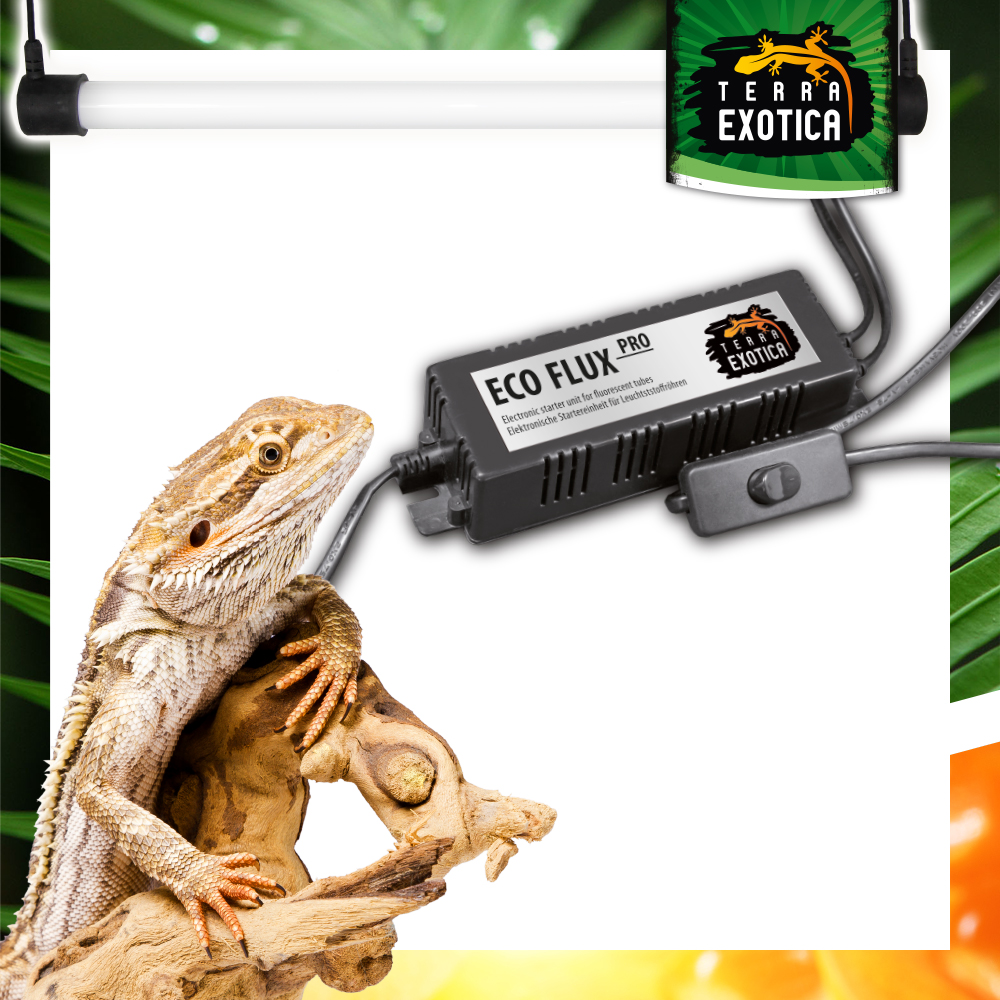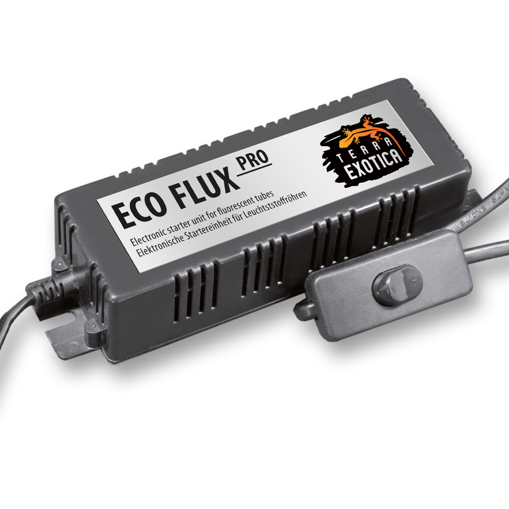 Die Terra Exotica ECO FLUX Pro Electronic Starter Unit verursacht im Gegensatz zu magnetisch betriebenen Systemen kein Flackern oder Flimmern von Leuchstoffröhren, wodurch sich Reptilien und Amphibien nicht gestört fühlen. Passend für alle marktüblichen Leuchtstoffröhren (T8, Ø26 mm). Das Vorschaltgerät verfügt über eine lange Zuleitung für eine flexible und bequeme Positionierung.